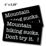 Mountain biking sucks! Don't try it. Paying homage to the surf crowd with their "surfing sucks, don't try it," we saw a huge uptick in Mountain Bikers on our local trails during covid. And from amidst the chaos, a saying was born.